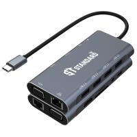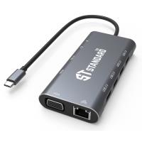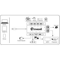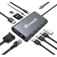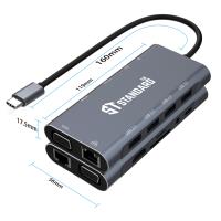 The C-type multifunctional docking station connects your laptop to USB peripherals, Ethernet, and monitors. The HDMI parent port supports up to 4K UHD video output resolution, the VGA port supports 2K output resolution USB parent port design to allow users to charge PDs, and the 1000M network can be accessed through the Type-C port by including the RJ45 Ethernet port. This product contains three USB 2.0 interfaces, which can be used to connect USB devices such as mouse, keyboard, USB 3.0 interface can be used to connect U disk, mobile hard disk and other devices, TF/SD card slot can read and write TF/SD memory card, with 3.5mm Jack audio output. Overall, the Type multipurpose docking station is the ideal choice for you to expand the Type-C port